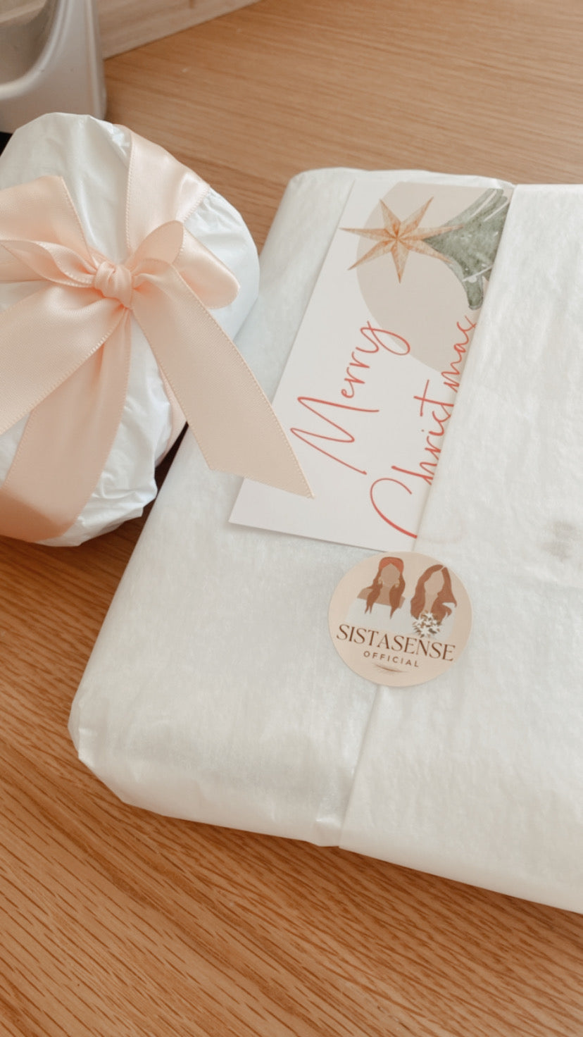 Presented gift wrapped in white tissue paper with a peach satin bow in white Kraft bag + a FREE Sista Sense Christmas card with your personal message included (optional)